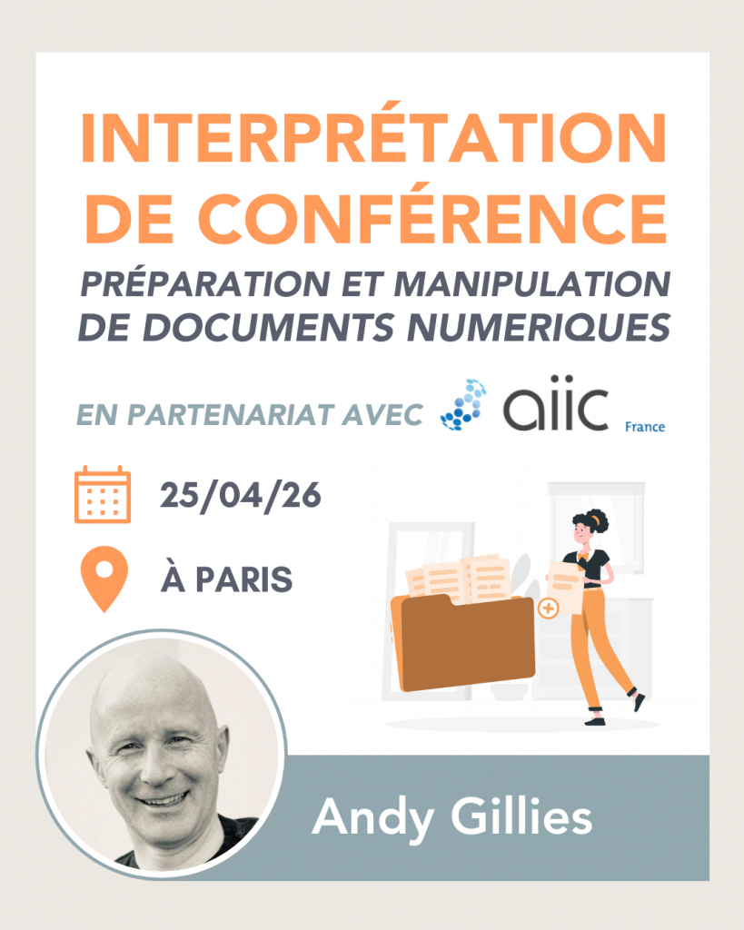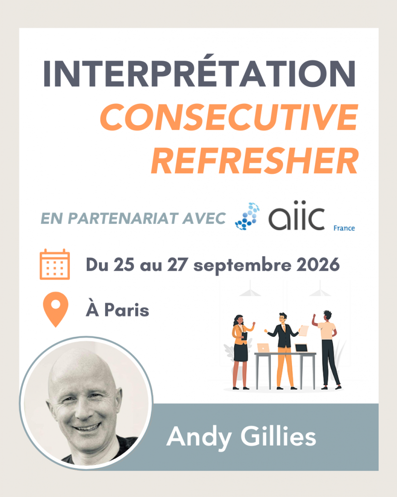 Rejoignez Andy Gillies pour un séminaire de 2 jours et demi dédié à l’interprétation consécutive, en partenariat avec l’AIIC France (Association Internationale des Interprètes de Conférence). Apprenez à exploiter la narration, la visualisation et la logique pour mémoriser et restituer les discours avec clarté, précision et confiance — même sous pression.